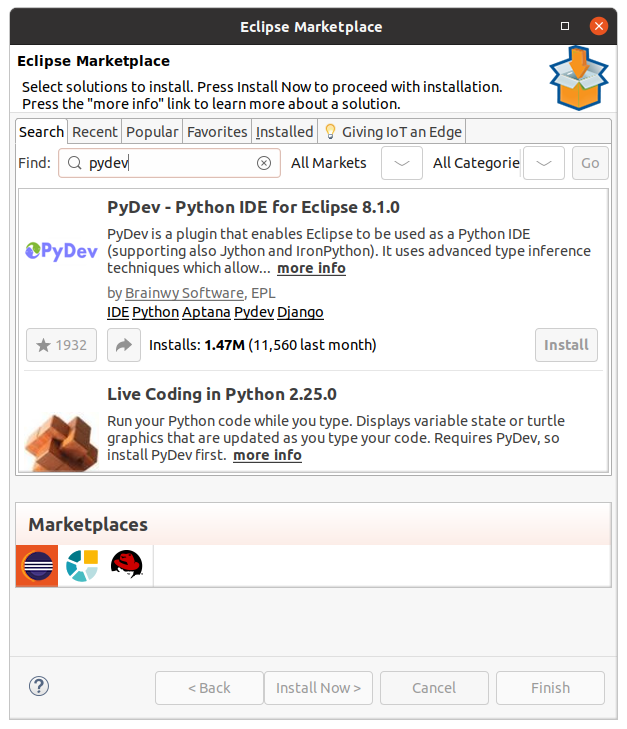 Let the install run and when it’s finished you’ll have a working IDE, but we still need to get you ready for Python. To install PyDev go to the Help menu and select “Eclipse Marketplace…”